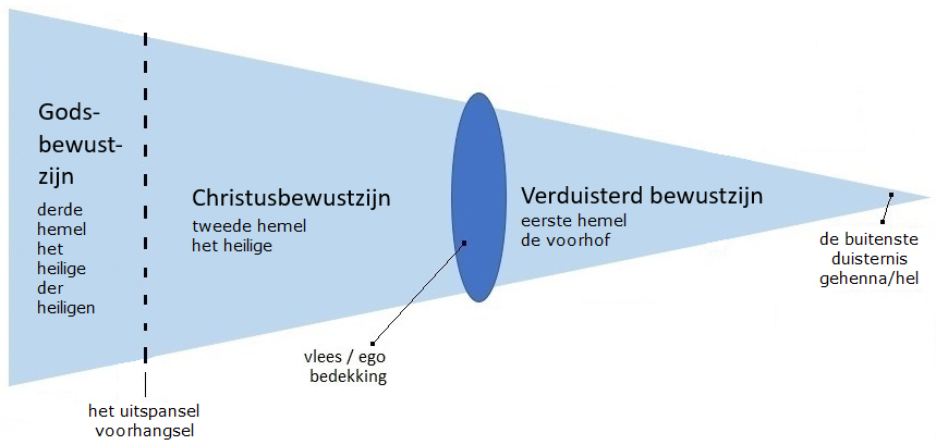 Deze drie lagen van bewustzijn beschrijven de verschillende bestaanswijzen waarin de mens kan participeren. Het verduisterde bewustzijn correspondeert met de eerste hemel en met de voorhof van de tempel: de sfeer waarin de mens de werkelijkheid voornamelijk waarneemt via de zintuigen en het onderscheid tussen goed en kwaad. Het Christusbewustzijn correspondeert met het heilige: de sfeer waarin de mens ontwaakt tot het licht van Christus dat reeds in hem aanwezig is. Het Godsbewustzijn correspondeert met het heilige der heiligen: de diepste eenheid met God waarin de schepping haar uiteindelijke bestemming bereikt.